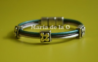 Pulsera con tres cueros y tres tacos metálicos con flor grabada. El cierre puede ser de imán o de clip tipo reloj. Se pueden combinar distintos colores: rojo, plata y negro (1º foto); morado, plata y azul (2º foto) También pendientes a juego. Precio: 10€